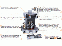 The grinding Process of the Main Mill is that the transmission device brings along the Central Shaft to drive. The upper part of the shaft connects with the Quincunx Rack, on the frame is loaded with the roller assembly, and forms a swinging pivot. The central shaft does revolve around the central rotation, at the same time it revolves around the grinding rings, and it self also rotates on account of the grinding effect. The shovel system, in the lower part of rollers, is loaded on the lower part of the Quincunx Rack. In the process of rotating of the shovel and the roller, the material will be fed gasket layer between the rollers and ring. The outside centrifugal force (compression force) yielding in this process will process the material into small powder, thus the desired powder is obtained.